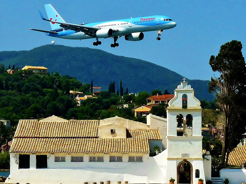 Заходящие на посадку самолеты можно увидеть совсем близко, а любители ярких фотографий могут сделать на Корфу фото с пролетающим самолетом.