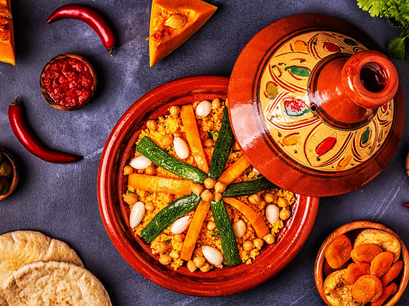 Словом «тажин» обозначают и само блюдо, и глиняный горшок с конической крышкой, внутри которого на медленном огне готовятся различные ингредиенты (говядина, баранина, курица, овощи и т.д.). Вы можете попробовать его практически где угодно: на придорожных остановках, в кафе и ресторанах.