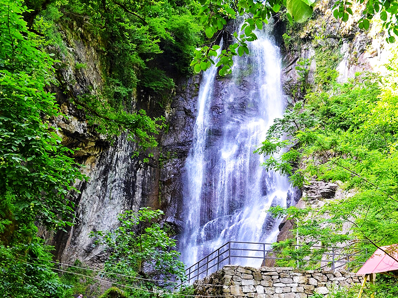 20-метровый водопад впечатляет своей первозданной красотой! Неподалеку от водопада – мост царицы Тамары, он тоже часто попадает в объективы фотолюбителей.