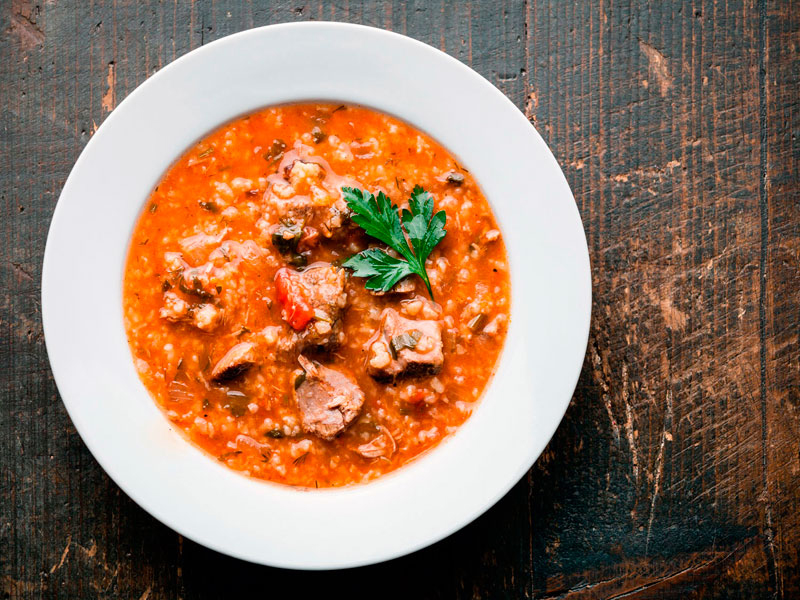 Харчо – широко известный суп грузинского происхождения, который переводится как «говяжий суп». Оригинальный вкус супу придают сливы, чеснок, орехи, зелень, входит сюда и рис.
