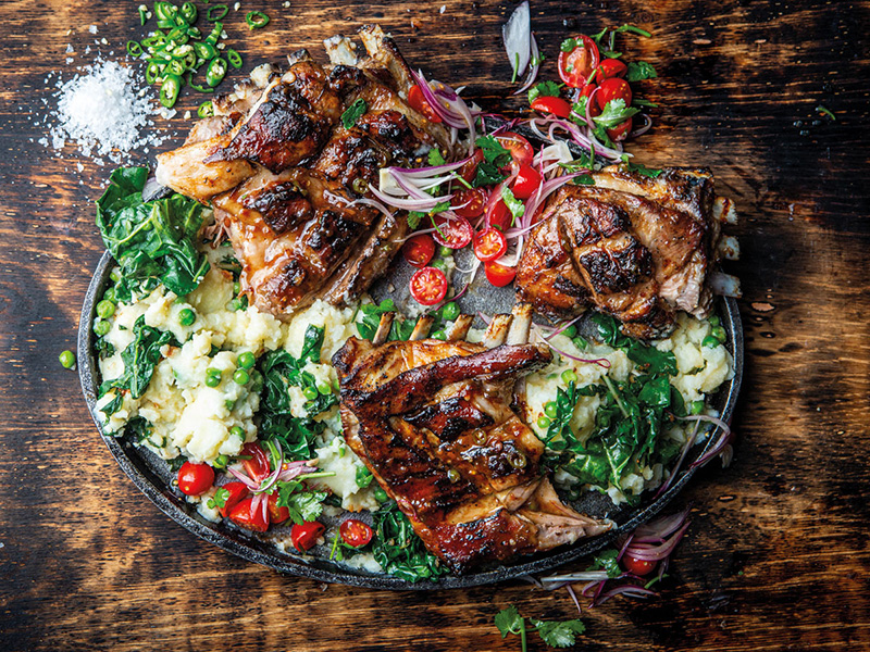 Он готовится из картофельного пюре, кукурузы и гороха или зелени в разных вариациях.
