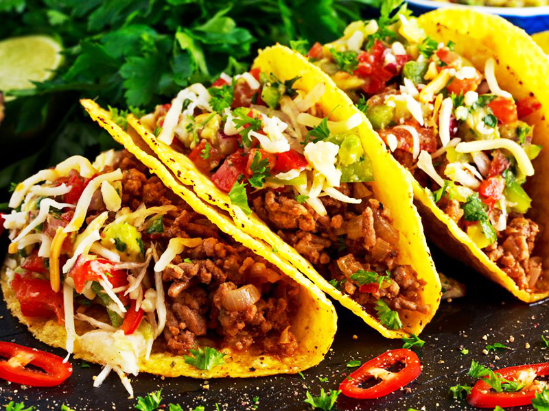 Тако – популярные лепешки из кукурузной муки с начинкой, куда входят фарш, фасоль, помидоры, ветчина, острые специи.