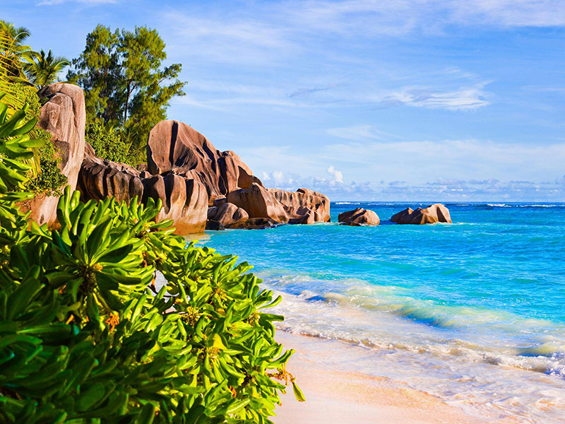 Визитная карточка Сейшельских островов - валуны причудливых форм, пальмы у воды, прозрачная вода.